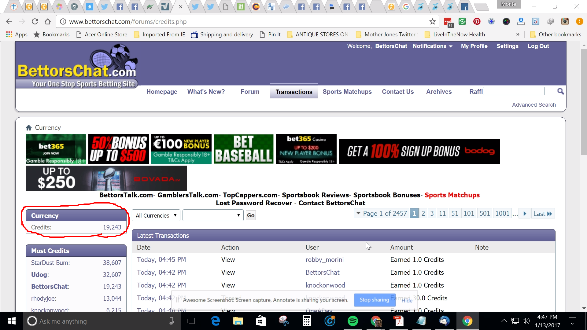 Once you have clicked on Transactions you will see the total BettorsChat Reward points that you have located at the left under "Currency"